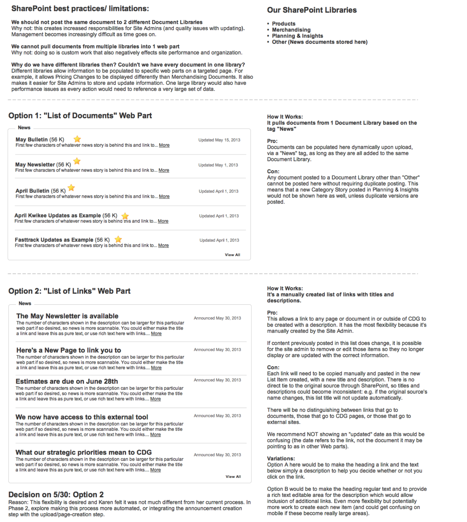 To the right is a mid-level conceptual wireframe I created that shows pros and cons for two versions of a web part. Understanding our technical platform's best practices and limitations for development was a challenge for stakeholders and product owners in this case, so outlining our options in detail was critical to choosing a direction in which we could move forward.