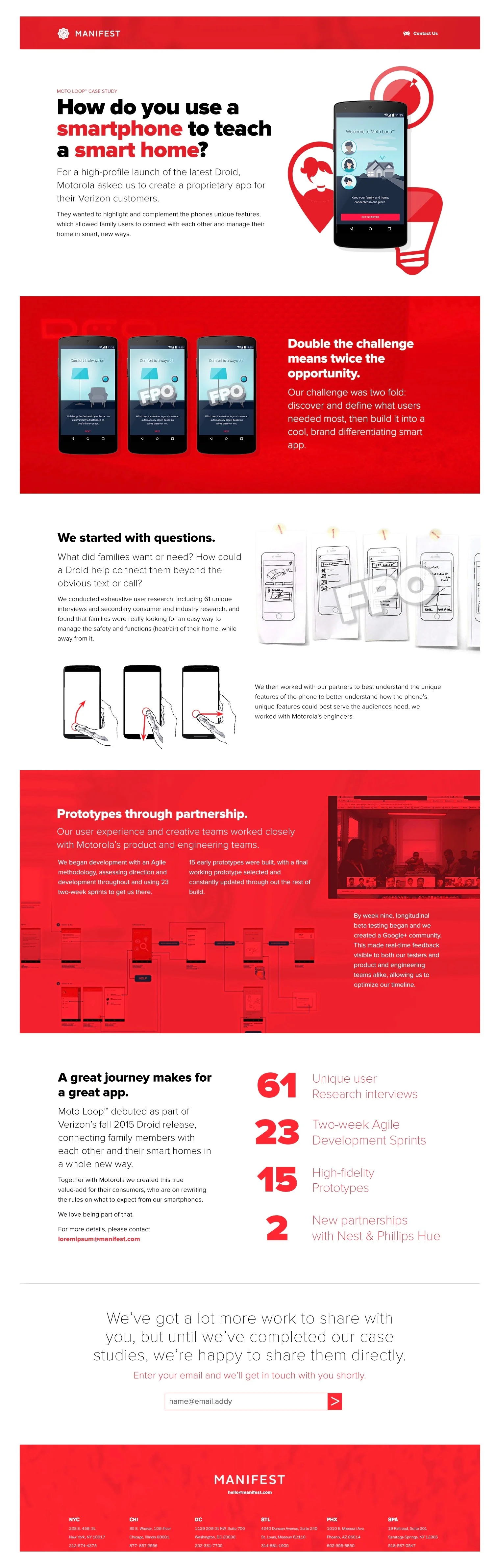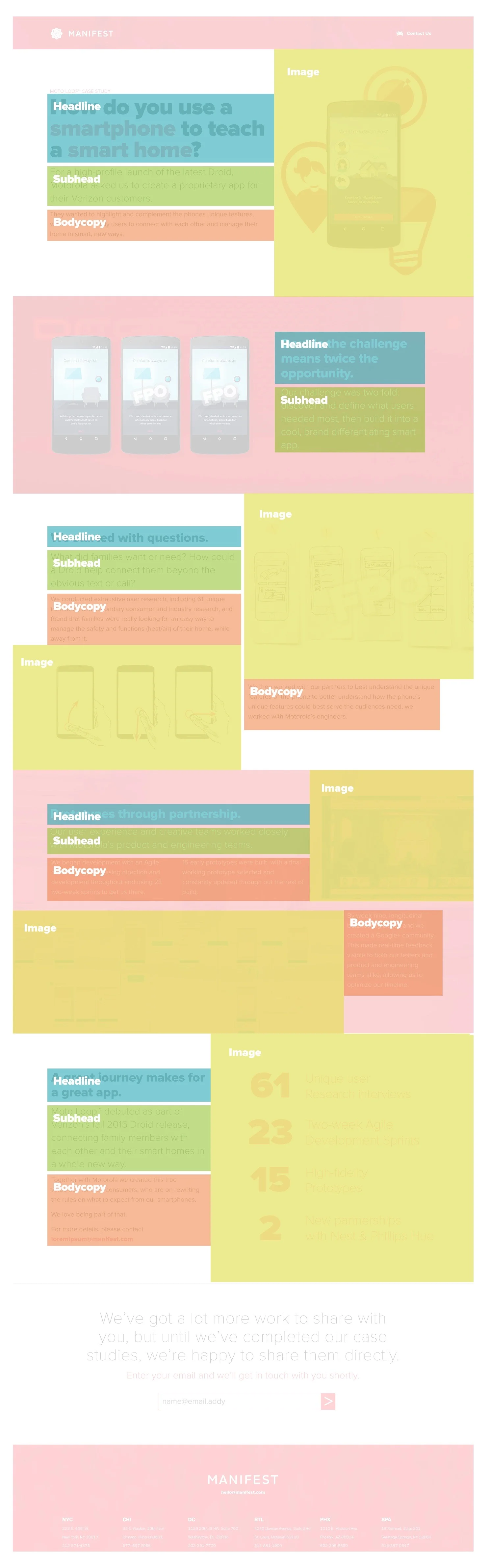 I can punch out a pretty decent wireframe when I need to. I usually use Axure. I created the wire on the left as a foundational template for a flexible layout that could be used for case studies. Visual designers on my team then adopted the wire into a more visual representation of content structure and eventually turned it into the final product we see on the right.